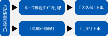 長野駅善光寺口から、アルピコ交通70番系統ループ橋経由戸隠高原行きの「大久保」下車もしくは、アルピコ交通73番系統 県道経由戸隠中社行き「上野」下車でお越しください。